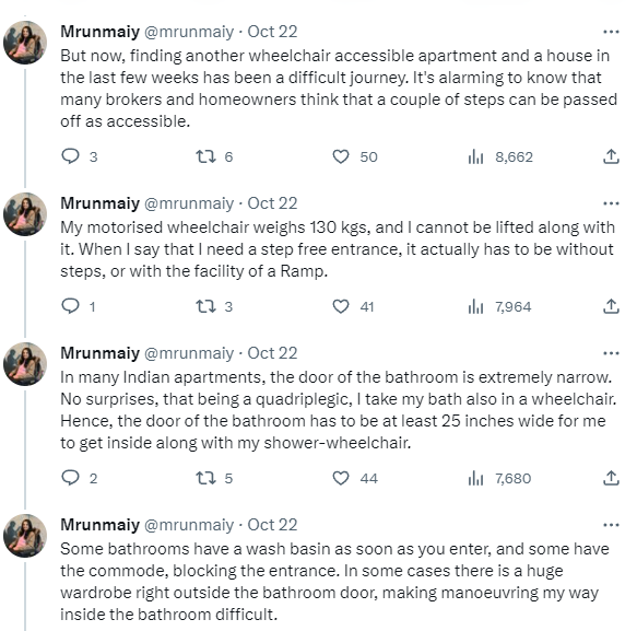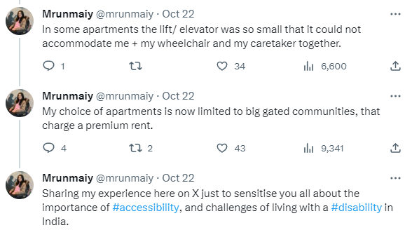 她补充说:“在一些公寓里,电梯太小了,不能同时容纳我、我的轮椅和我的看护人。”正是在这一点上,@mrunmaiy呼吁在平台上建立一个宽敞的封闭式社区。
