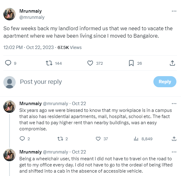 “几个星期前,我的房东告诉我们,我们需要搬出自从我搬到班加罗尔以来一直住在那里的公寓,”她开始说。她接着描述了在过去的六年里,她是如何住在工作园区内的一套住宅公寓里的,这既满足了她的需求,又提供了便利。