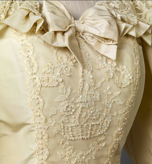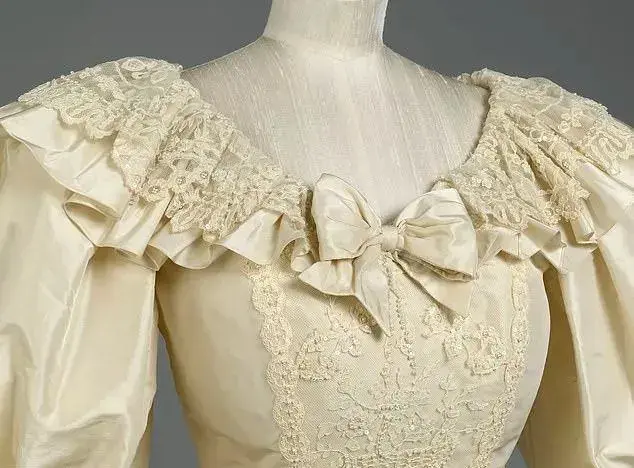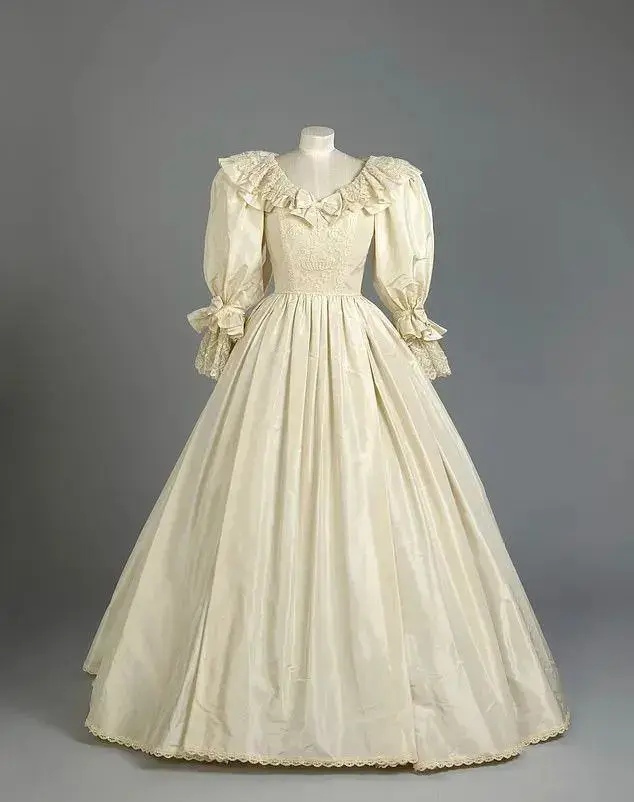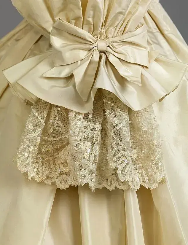 轻柔的领口和蓬松的袖子都被蝴蝶结和荷叶边装饰着,这种设计风格也因戴安娜王妃而在80年代初掀起了时尚潮流。整条裙子的下摆是一件巨大且蓬松的衬裙,经过精细地修剪形成轮廓。