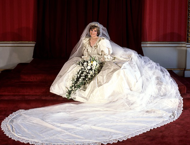 这件经过不断打磨和设计调整的婚纱让戴安娜王妃在婚礼那天大放光彩,长达7.6米的拖尾配上63.5厘米的头纱,让美丽动人的王妃在英国王室的历史上留下了惊鸿一瞥。