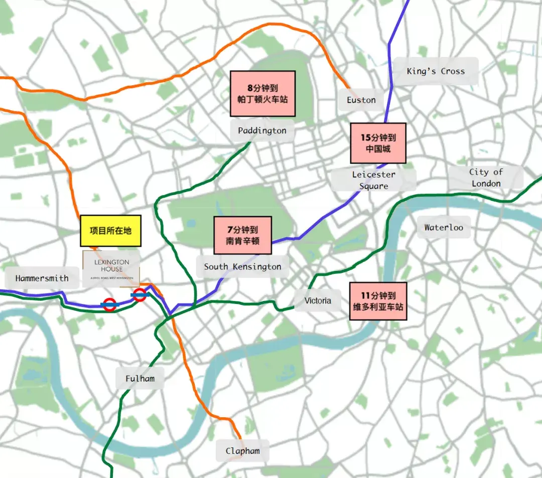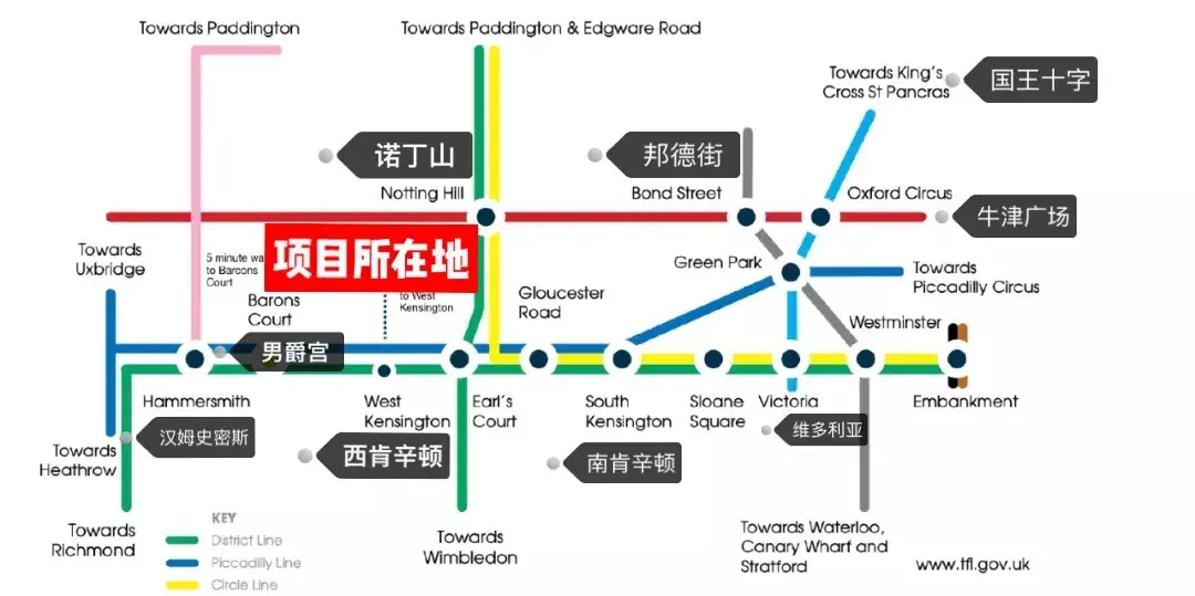 项目靠近西肯辛顿和男爵宫站,可乘坐区域线和皮卡迪利线,通往市中心。
