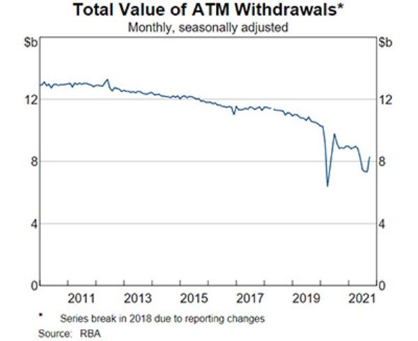 过去6个月ATM取款金额比3年前同期下降了30%左右。虽然纸币仍然在许多交易中使用,但趋势很明显。